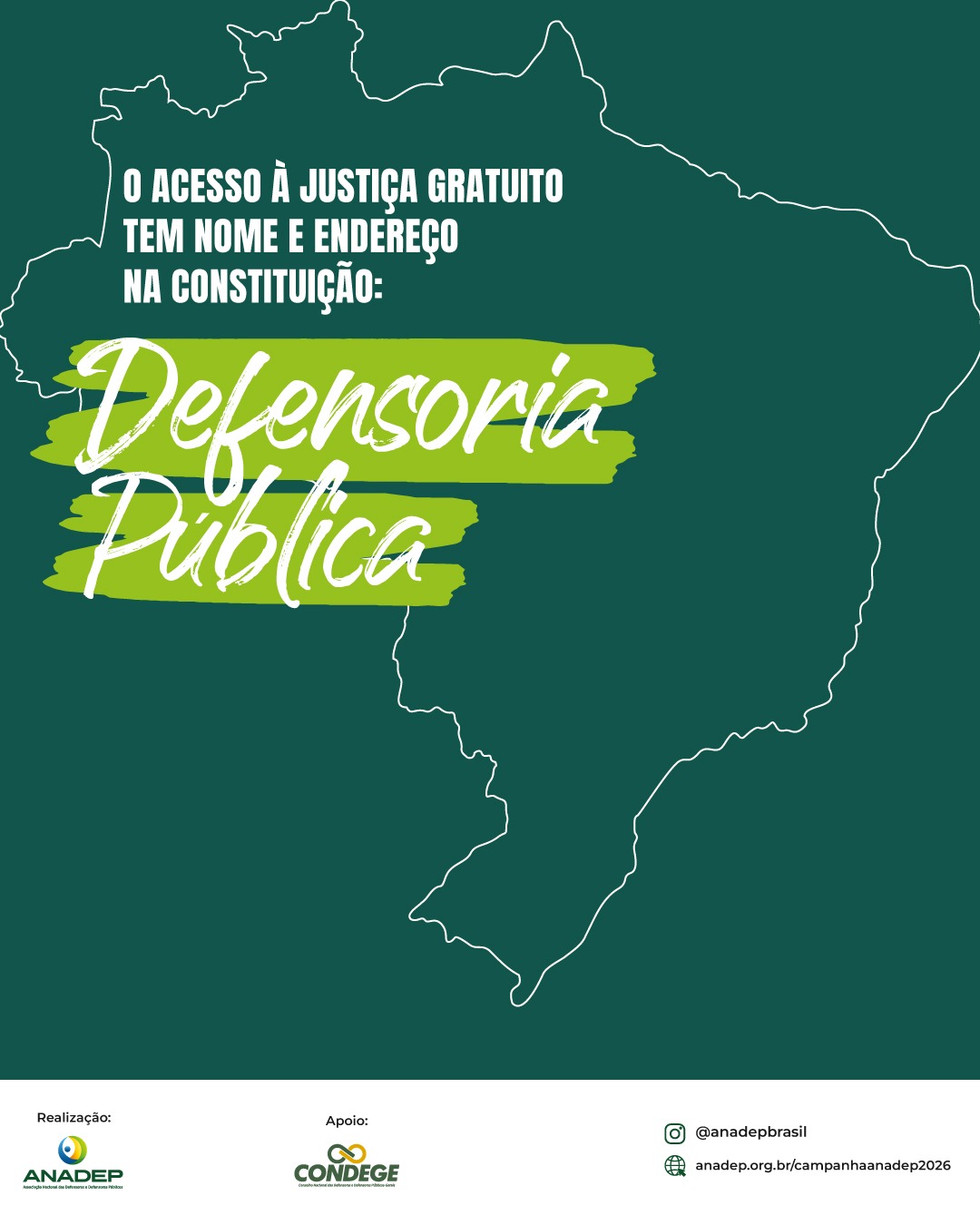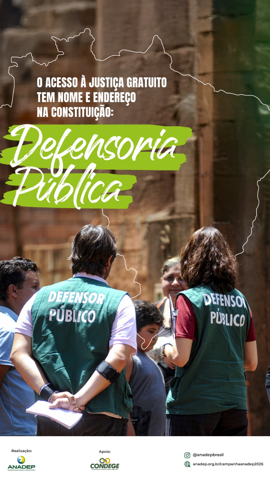 A Campanha Nacional “O acesso à justiça gratuito tem nome e endereço na Constituição: Defensoria Pública” é uma iniciativa da ANADEP e conta com o apoio das Associações Estaduais, das Defensorias Públicas dos estados e do Distrito Federal e do Conselho Nacional das Defensoras e Defensores Públicos-Gerais (Condege).